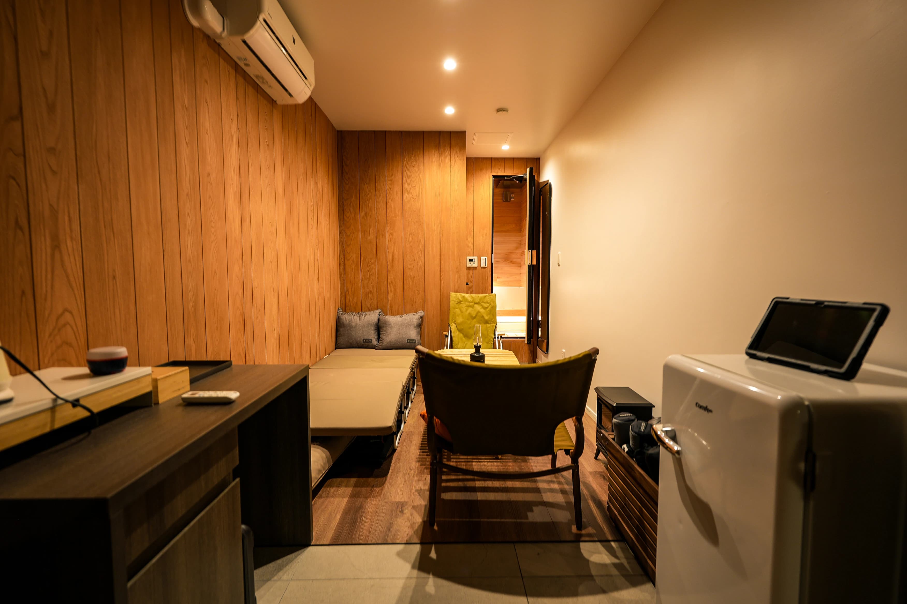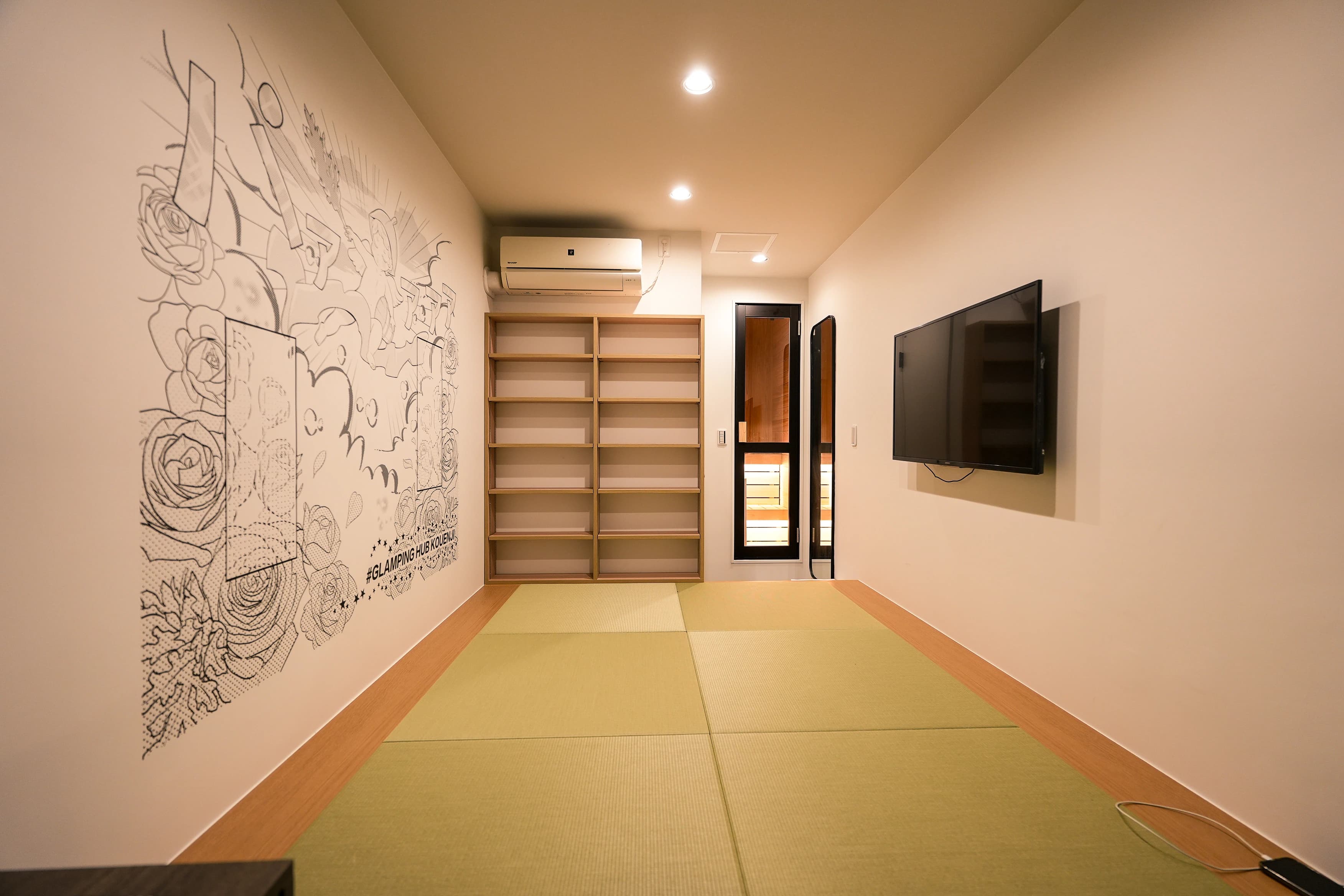 グランピング×サウナ: 普段なかなか体験できないアウトドアの世界を、手軽に体験できる部屋です。本格的なキャンプギアに囲まれながら、まるで自然の中にいるかのような気分でリラックス。サウナで汗を流した後は、焚き火でマシュマロを焼いたり燻製を作ったり。都会の喧騒を忘れ、自分だけのプチグランピングを味わえます。